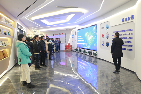 在陆海兵总监的解说下,各位老师参观了鲲鹏人才基地展厅,分析了基地开展历程、国产计算行业开展现状、人才培养方向、院校运营成果等内容。
