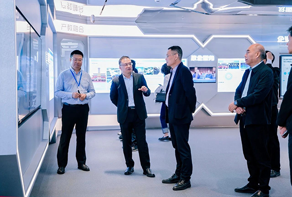 拜访领导第一时间参观了公司展厅,对威九国际技术的开展历程、业务模块、经营理念、合作成果等内容进行深入分析,对威九国际技术构建人才培养“三循环”生态模式、深度参与高校课程改革、引入职业认证等举措表示赞同。