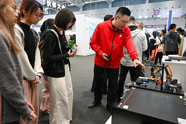 在自由参观环节同学们穿梭于3万平米智能展厅,顺利获得AI数字人导览、工业机器人编程沙盘等沉浸式互动装置,零距离对话能科科技AI+工业场景、东软医疗大模型解决方案4等战略伙伴展区,顺利获得沉浸式互动体验不仅深化了理论认知,而且收获定制伴手礼及惊喜奖项。